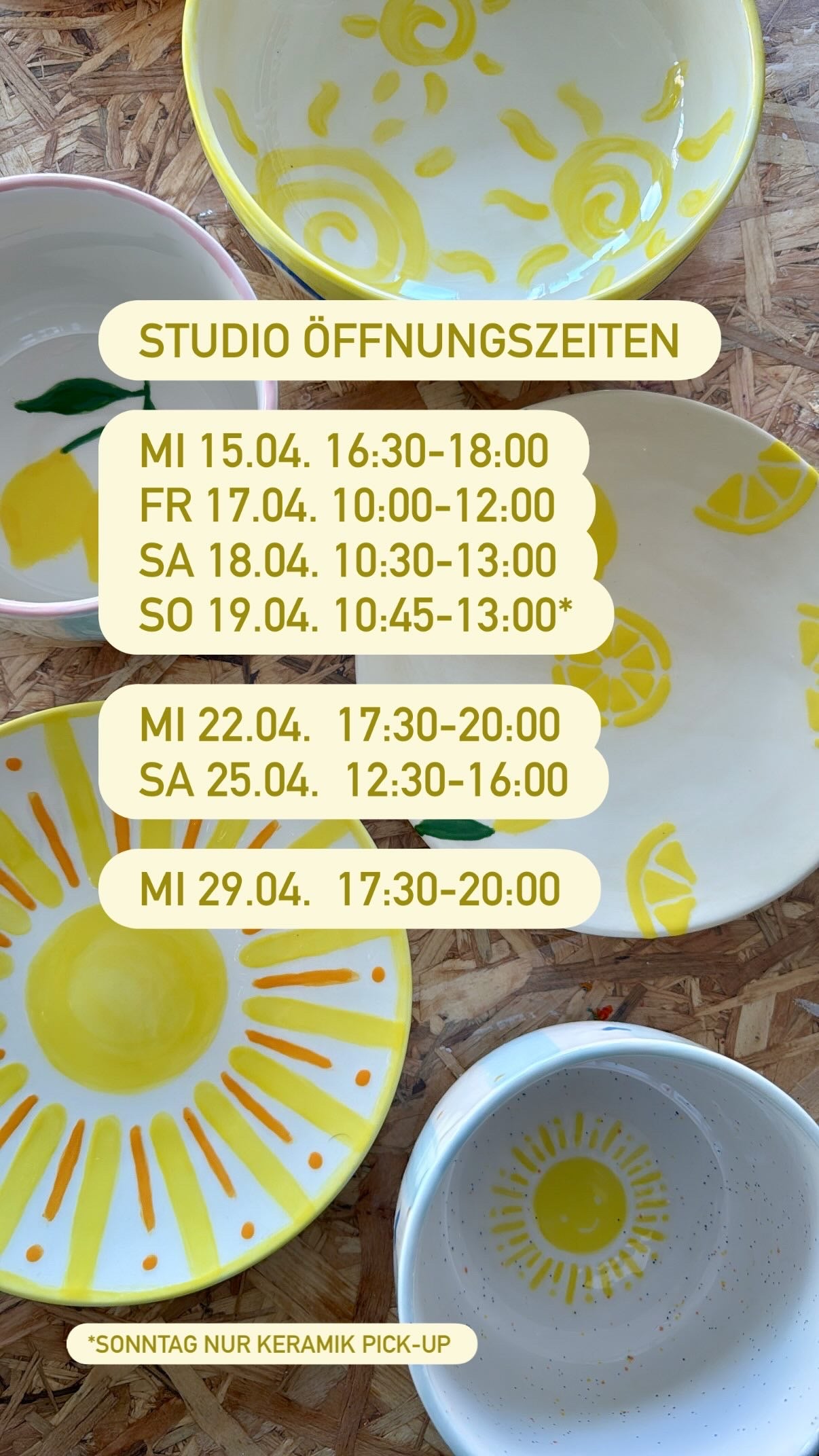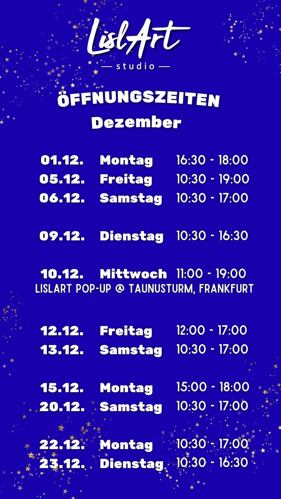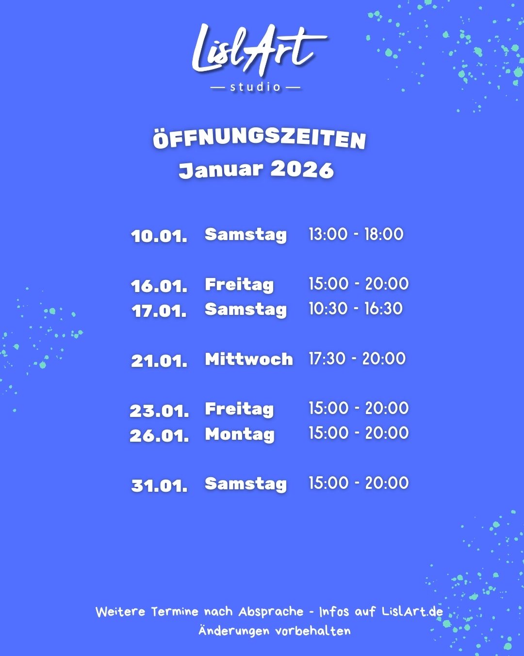 Hier findest die aktuellen Öffnungszeiten des Studios, während denen du zum Shopping oder Abholen deiner fertigen Kunststücke kommen kannst.