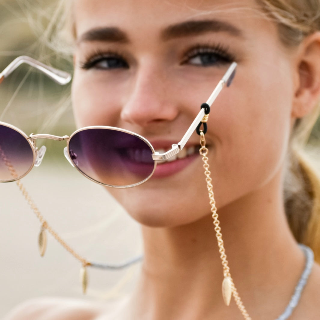 Diese schicke Sonnenbrillenkette von Sunny Cords aus Australien ist der perfekte Mix in Sachen Vielseitigkeit, Stil und Look... An ihrer goldenen Kette befinden sich hübsche hellblaue Perlen und goldene Federn. Du kannst die trendige Kette nicht nur an deiner (Sonnen-)Brille, sondern dank zweier Karabiner auch als Halskette tragen oder elegant um das Handgelenk wickeln.